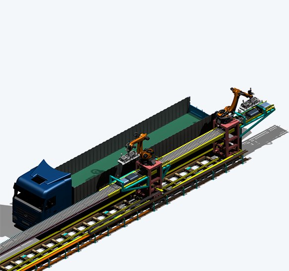 此装车系统由一至两台六轴机械人、一套机器人行走系统、一套输送系统、一套车辆探测系统、两套抓手和一套装车系统组成。此方案适用于空间有限,粉尘少的开放式环境。